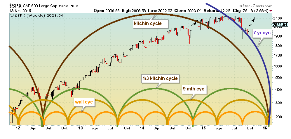 Note that the nested bottoms match the major turning points (bottoms?) of the Bradley cycles while the top July 1 (Bradley chart) matches the top of the nine month cycle. Also, may see some longer cycles bottoming (Kitchin, Juglar) in early 2016....